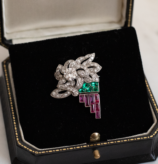 Art Deco LaCloche Emerald, Ruby and Diamond Brooch