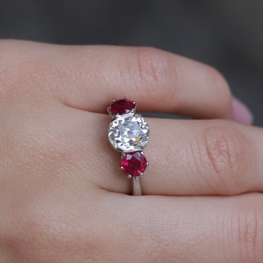 1.99ct Old Cut Round Diamond and Ruby Three Stone Ring