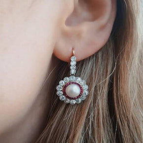 Platinum 0.60ct Old Cut Round Diamond and Calibre Ruby Target Cluster Earrings