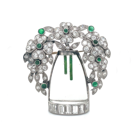 Art Deco Crystal, Emerald And Diamond Flowers In A Vase Brooch