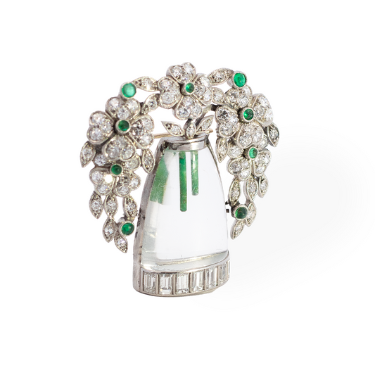 Art Deco Crystal, Emerald And Diamond Flowers In A Vase Brooch