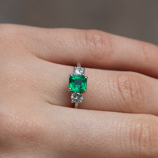 0.81ct Certified Colombian Square Cut Emerald and Round Diamond Three Stone Ring