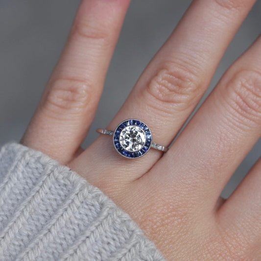 0.81ct Round Diamond and Sapphire Art Deco Style Target Ring