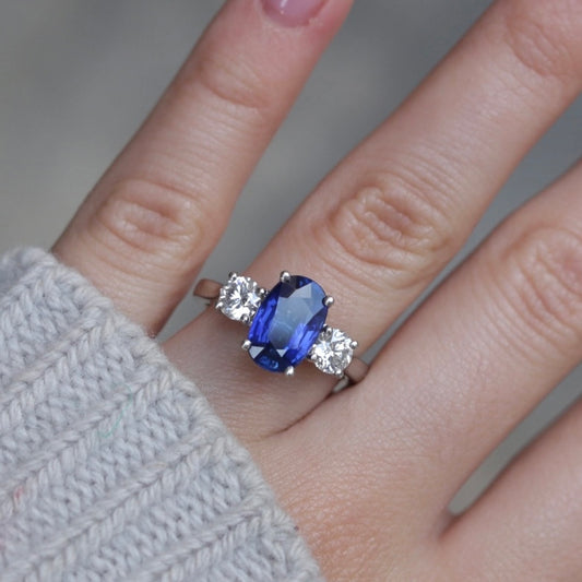 3.05ct Oval Cut Sapphire and 0.82ct Round Brilliant Diamond Three Stone Ring