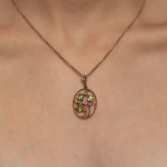 Pink Sapphire, Peridot And Seed Pearl Floral Pendant