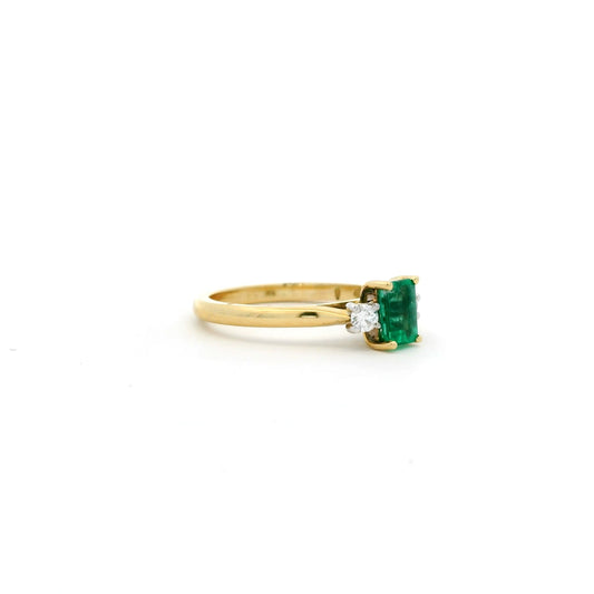 0.59ct Emerald Cut Emerald And Round Diamond Three Stone Ring