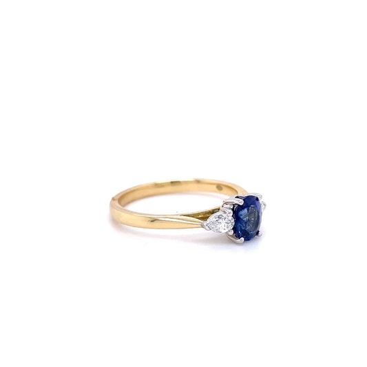 0.82ct Oval Sapphire And Pear Cut Diamond Three Stone Ring