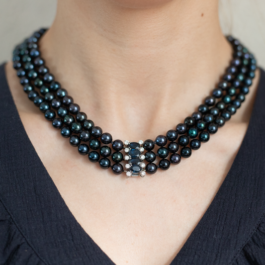 Three Row Black Pearl Sapphire and Diamond Necklace