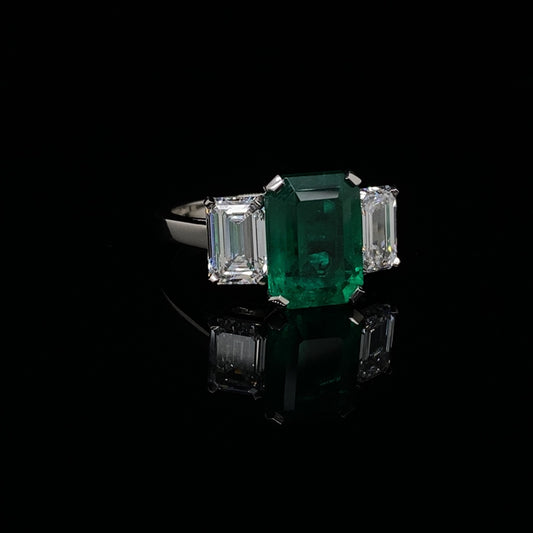 2.17ct Certified Colombian Emerald Cut Emerald And Tapered Baguette Diamond Three Stone Ring