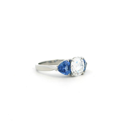 1.88ct Transitional Cut Diamond And Heart Cut Sapphire Three Stone Ring