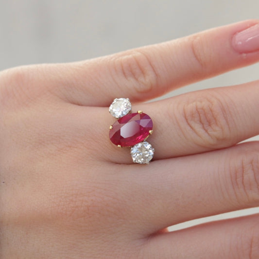 Oval Cut Ruby and Round Diamond Three Stone Ring