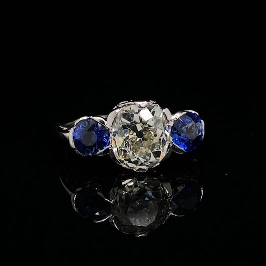 Old Cut Cushion Diamond 2.91ct and Sapphire Three Stone Ring