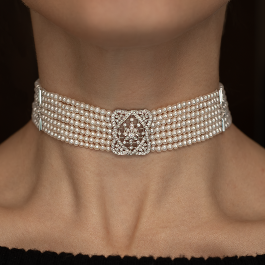 1.83ct Eight Row Pearl Choker Necklace With A Diamond Centre