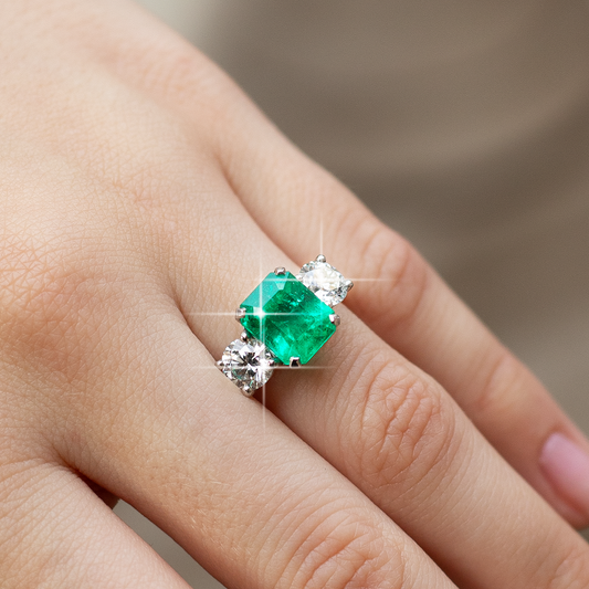 3.42ct Emerald Cut Emerald and Round Diamond Three Stone Ring