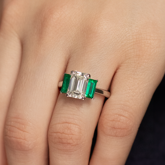 2.78ct Emerald Cut Diamond And Baguette Cut Emerald Three Stone Ring
