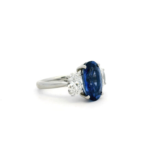4.82ct Burmese Unheated Oval Sapphire And Round Diamond Three Stone Ring