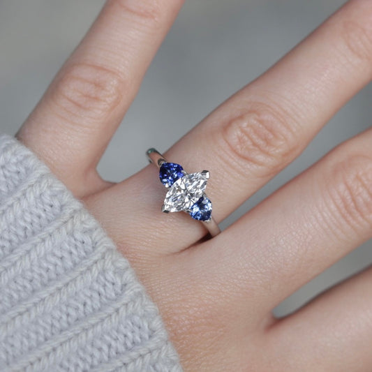 0.80ct Marquise Diamond and Heart Sapphire Three Stone Dress Ring