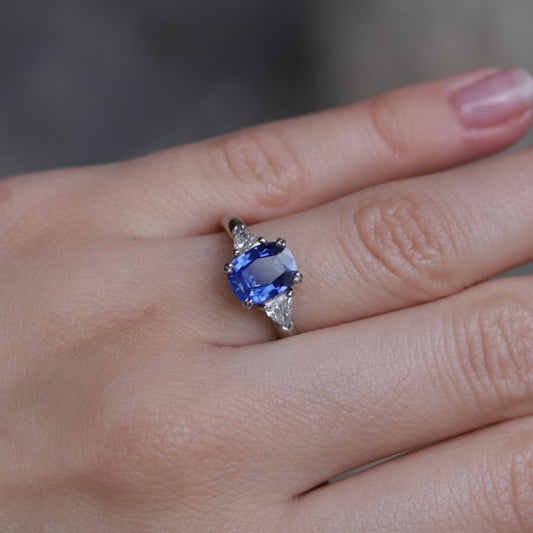 2.02ct Cushion Cut Sapphire and Pear Cut Diamond Three Stone Ring