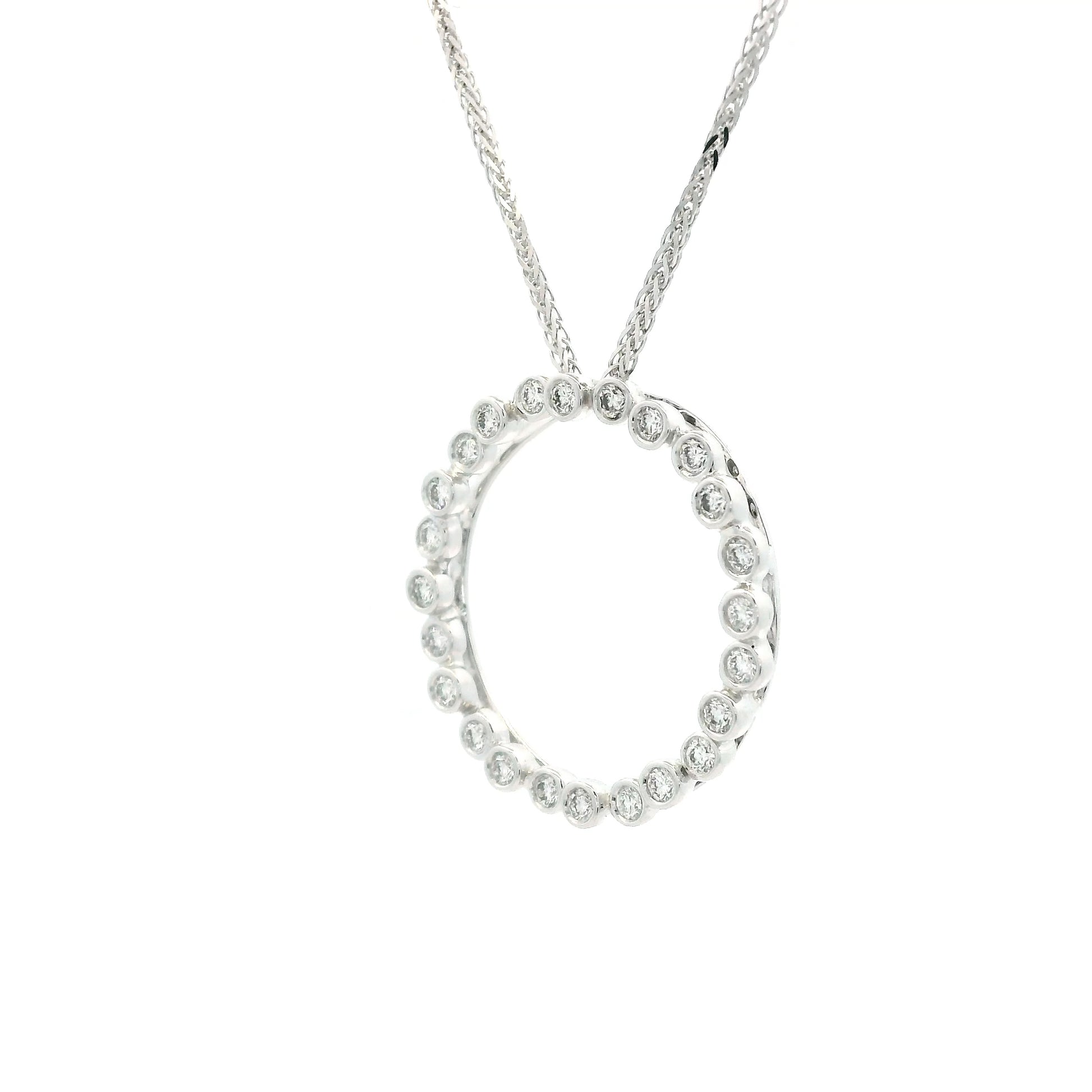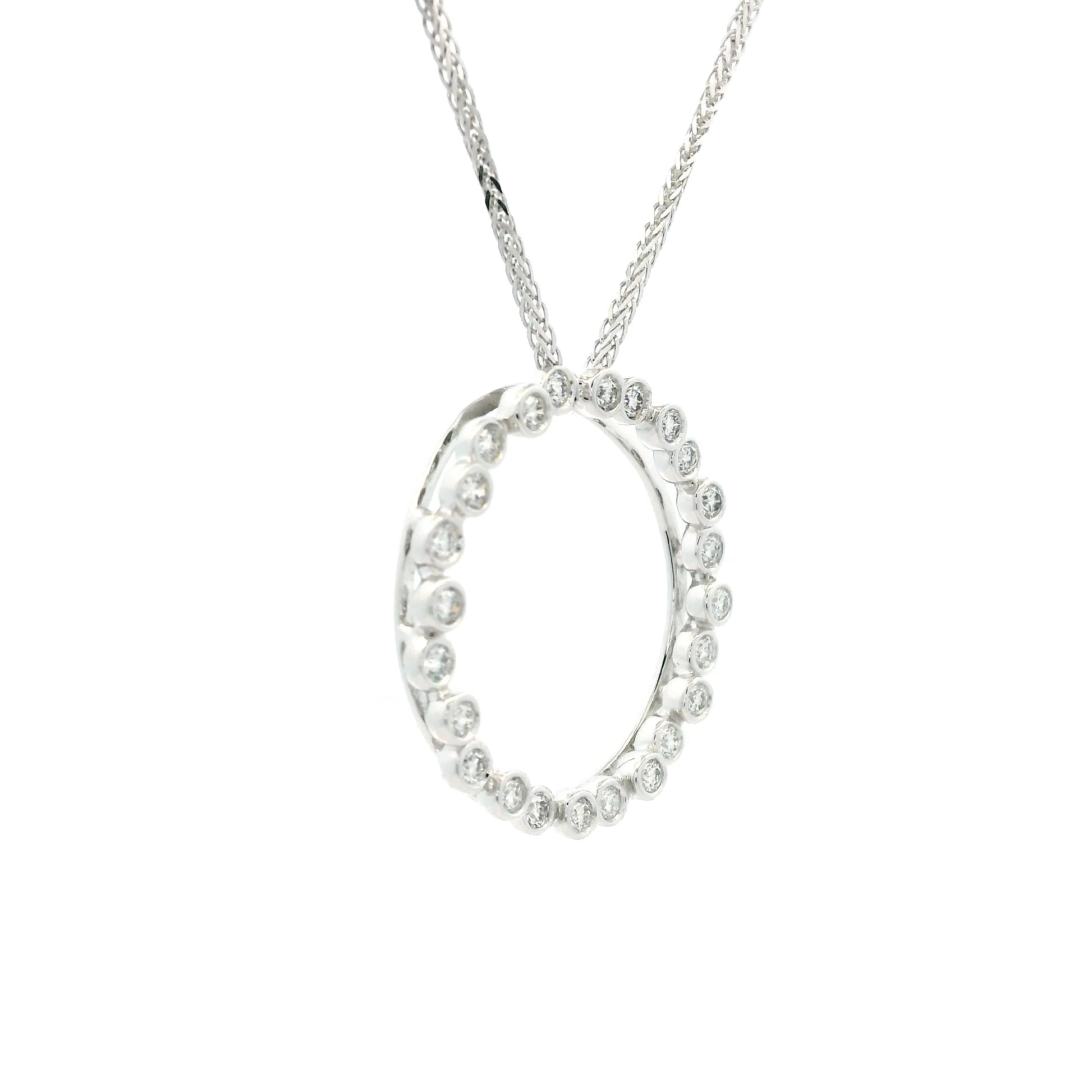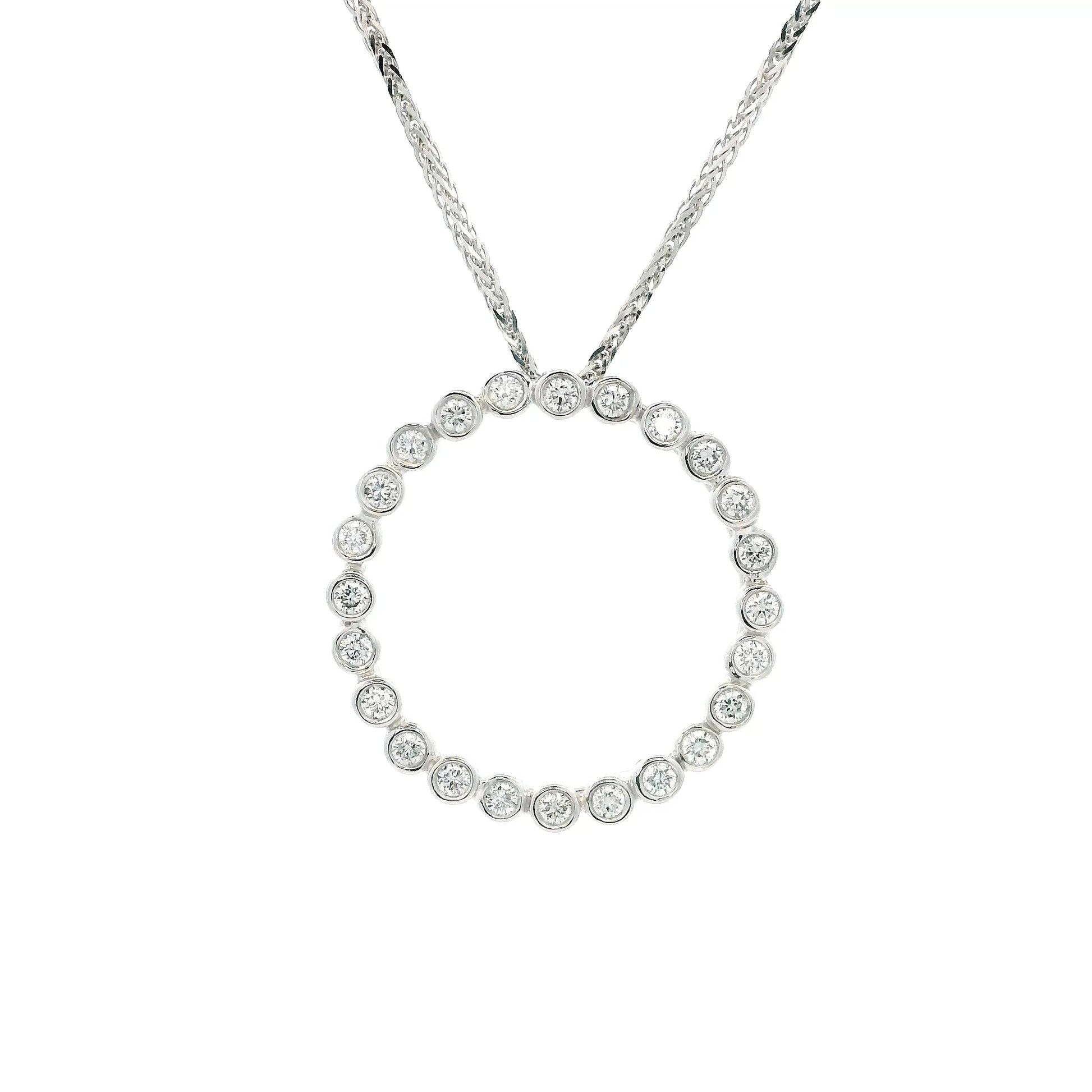 An 18ct white gold rubover round brilliant cut diamond circle pendant.