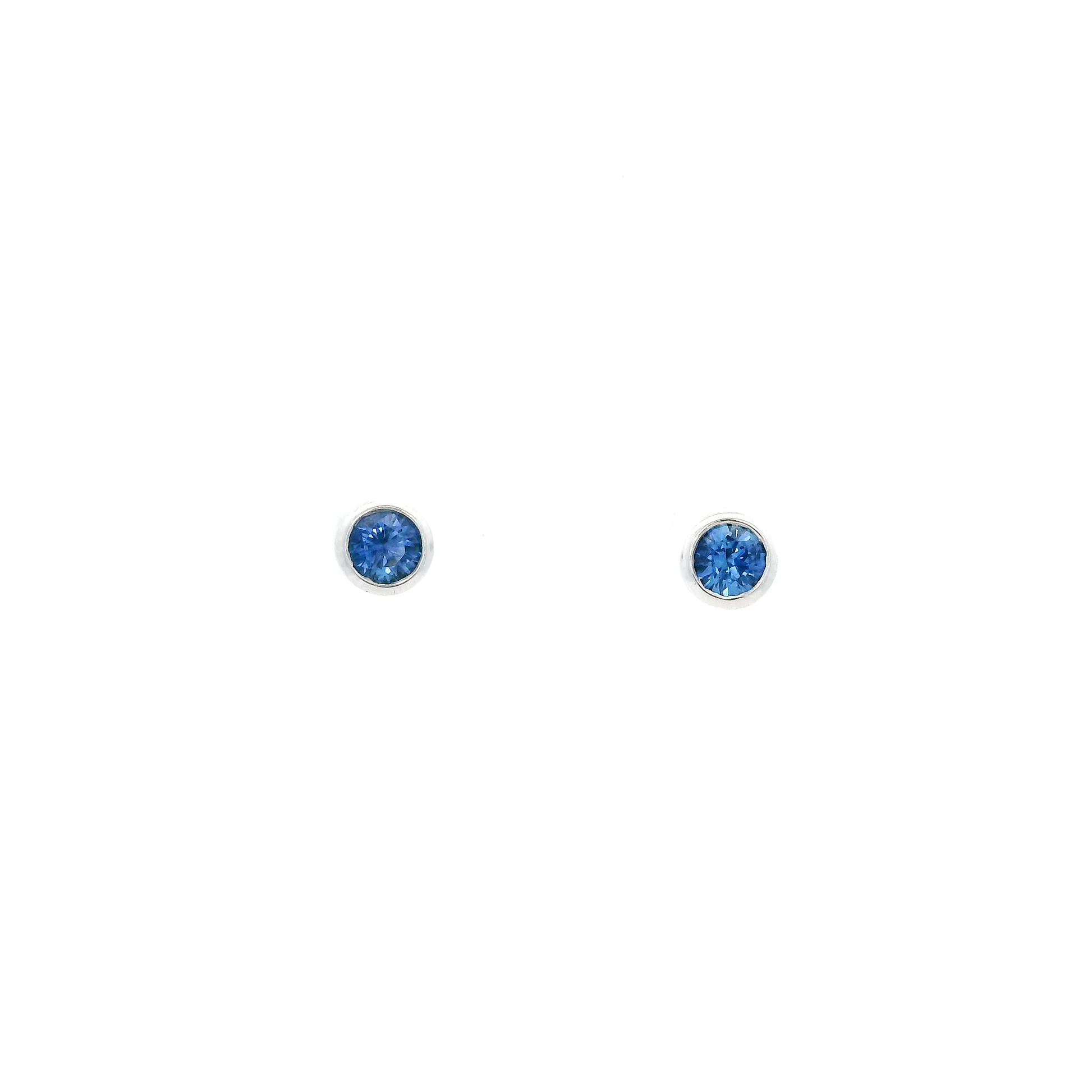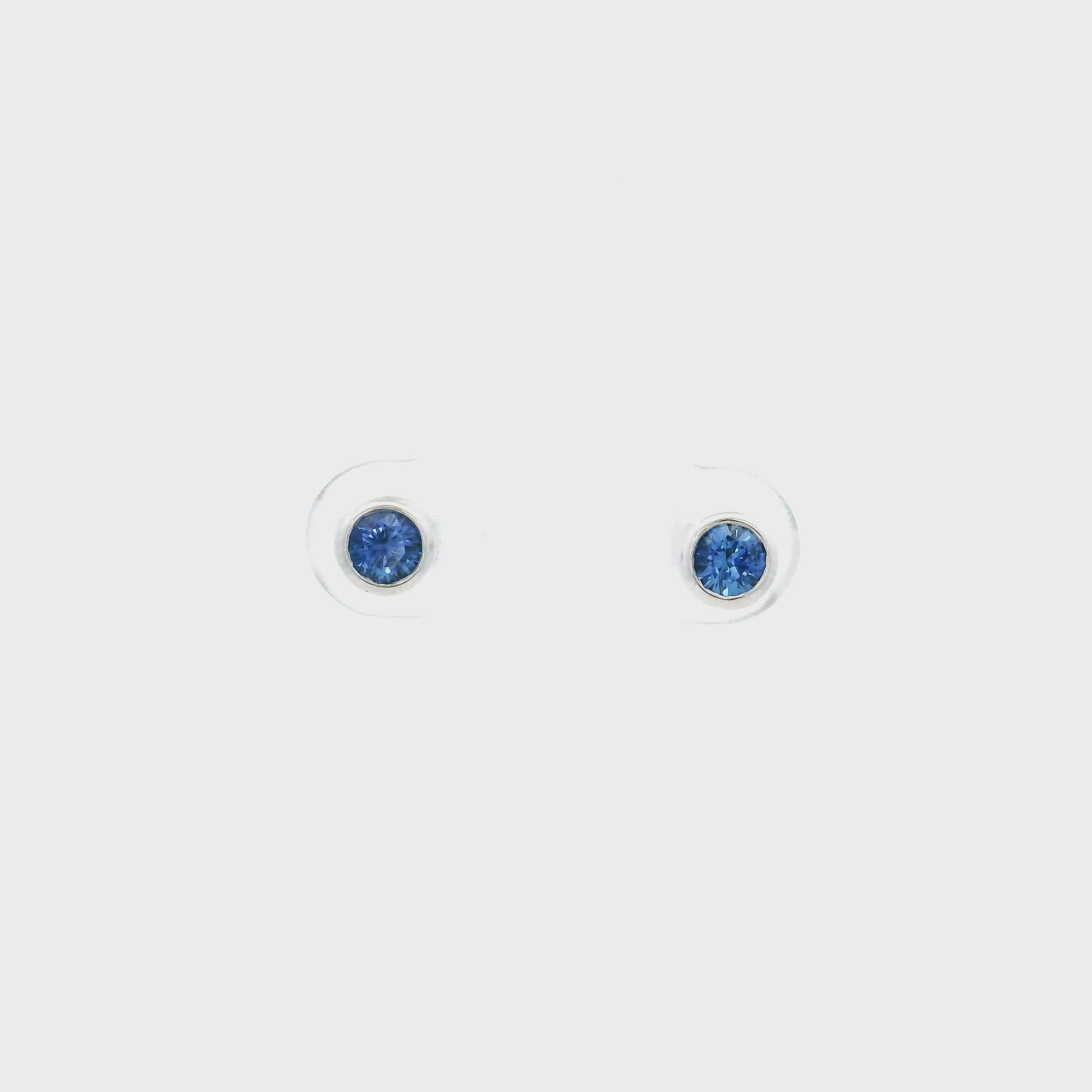 A pair of 18ct white gold rubover set round sapphire solitaire stud earrings.