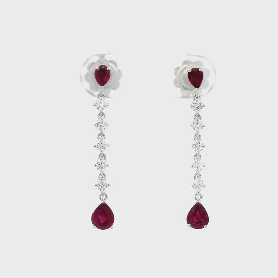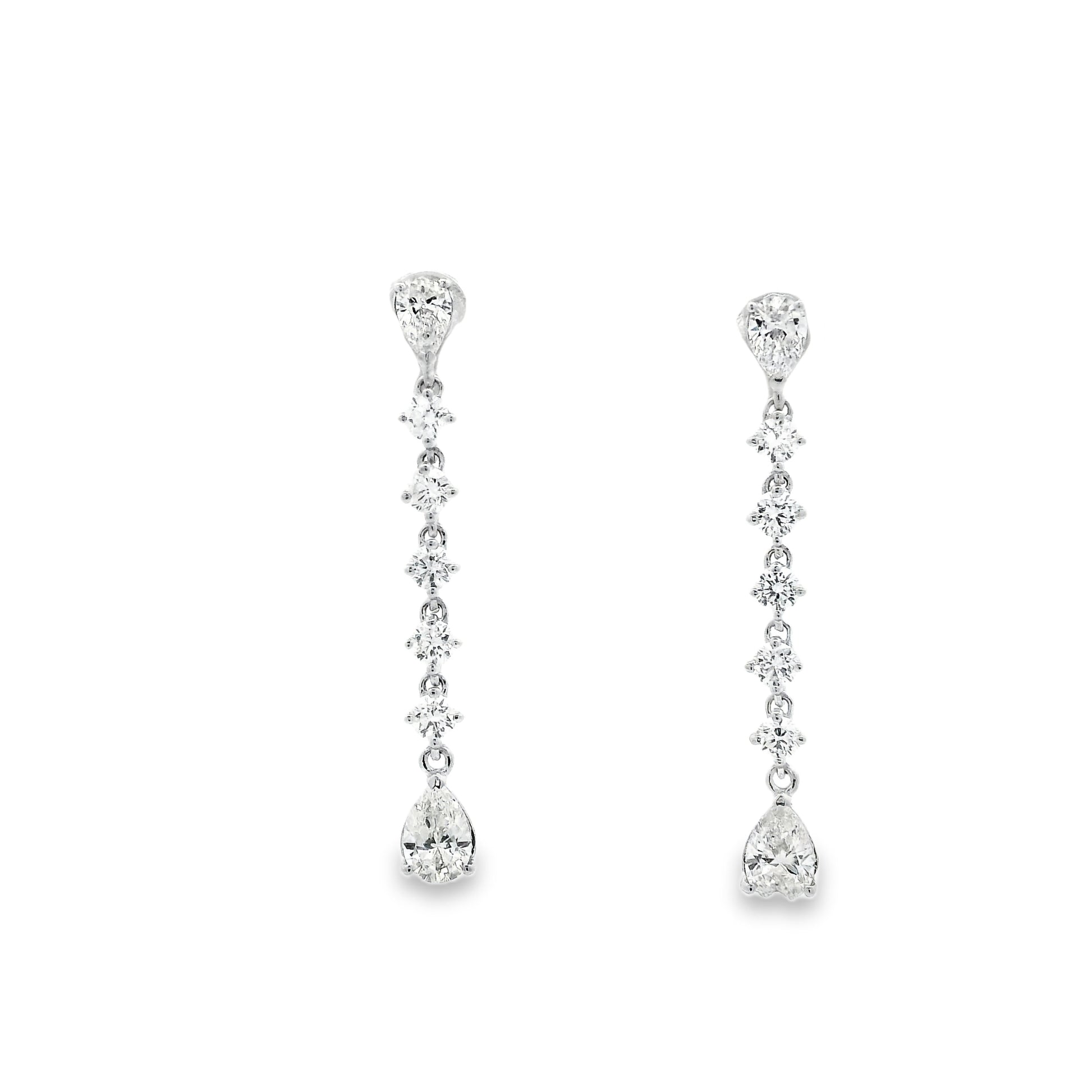A pair of 18ct white gold claw set pear cut gemstone tips with a line of round brilliant cut diamonds drop earrings.