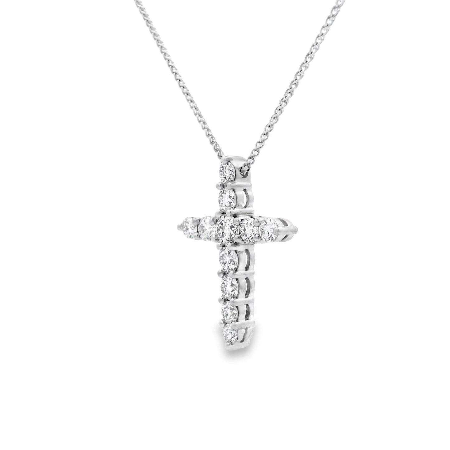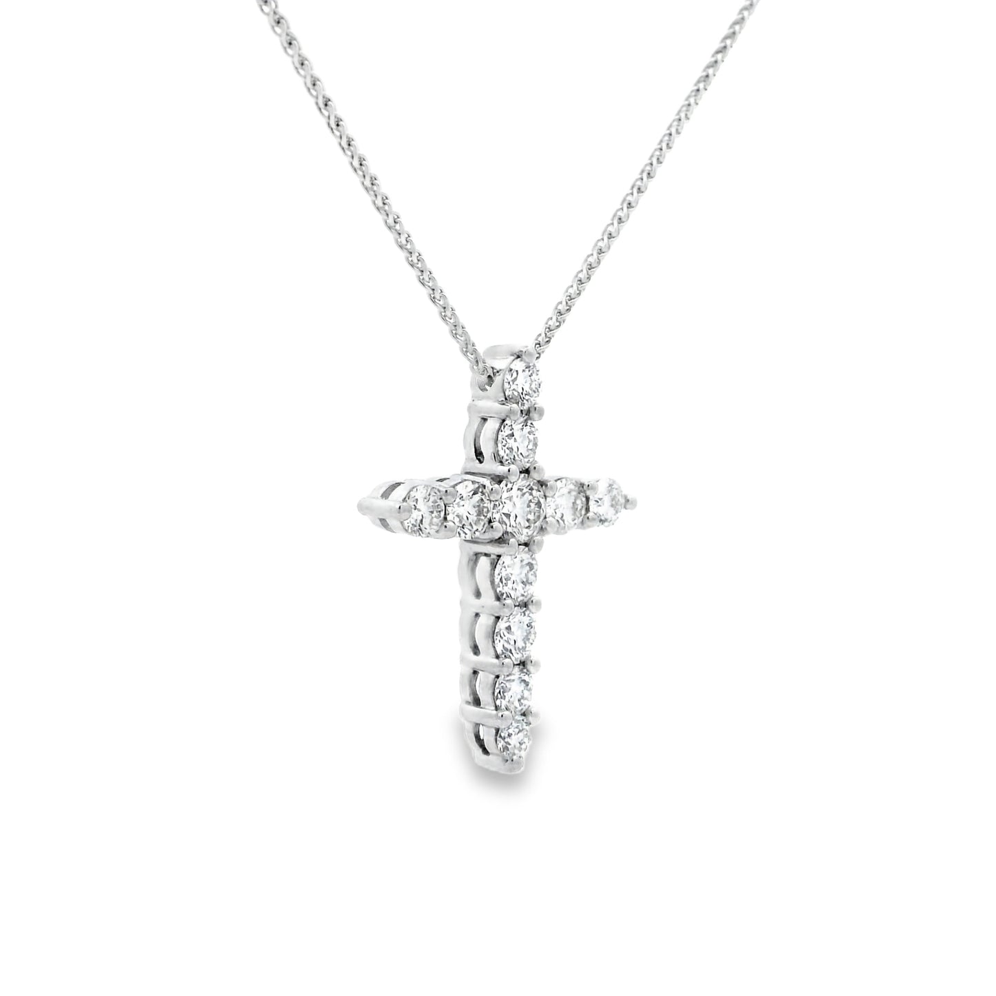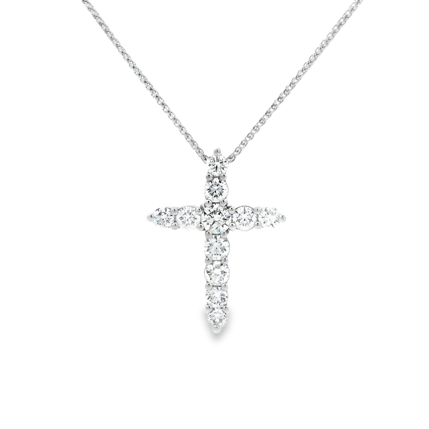 An 18ct white gold claw set round brilliant cut diamond cross pendant.