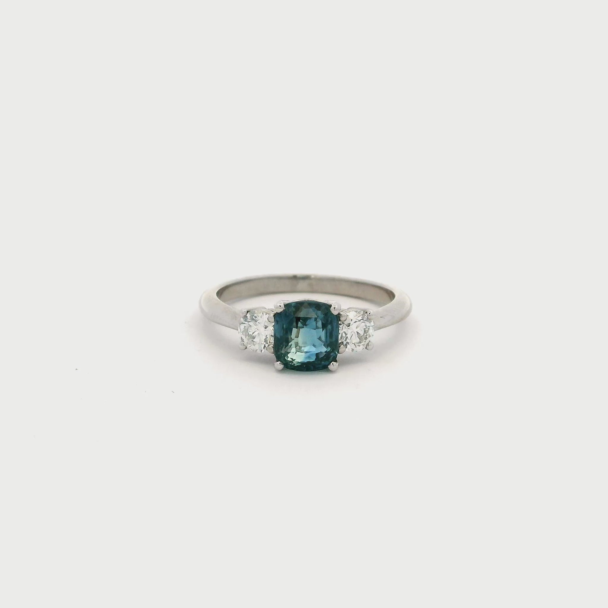 A platinum claw set cushion cut teal sapphire and brilliant cut diamond three stone trilogy ring.