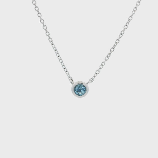 An 18ct white gold rubover set round aquamarine solitaire pendant with chain.