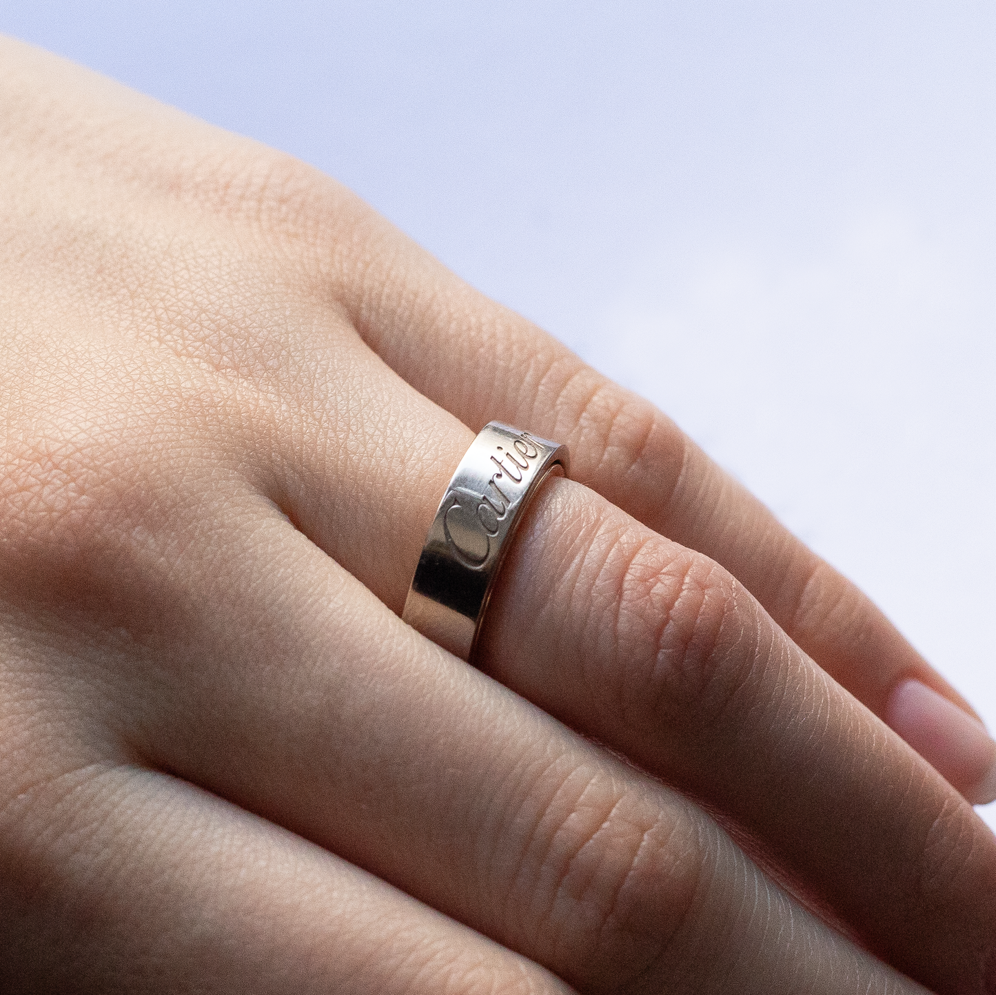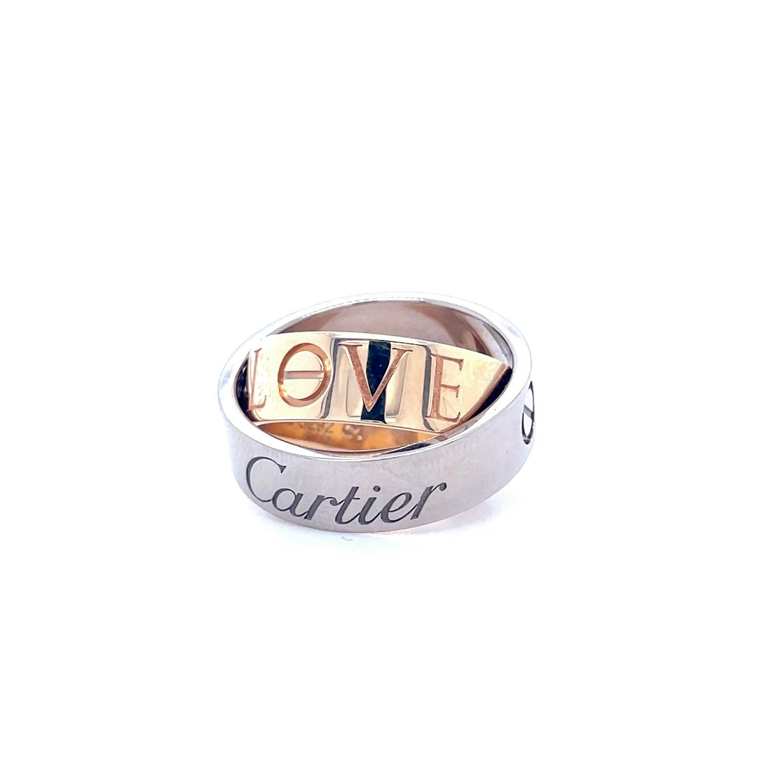 A vintage 18ct white and rose gold two band Love, Essence De Cartier ring by Cartier. The ring is designed as two classic Love Rings of identical width, the inner rose gold band is hinged and joined to the outer white gold band meaning that the bands are able to move over each other and can be worn in a varity of different ways as pictured. The white gold band is signed “Cartier” on the outside and 'LOVE' on the inner band with the iconic screw motif to either side.