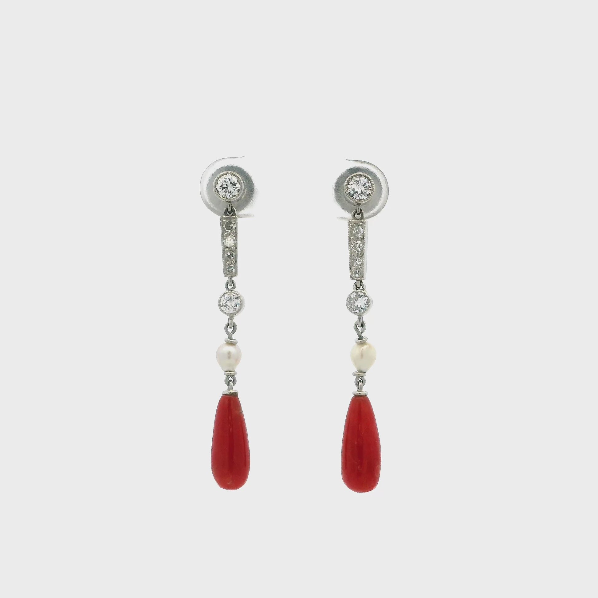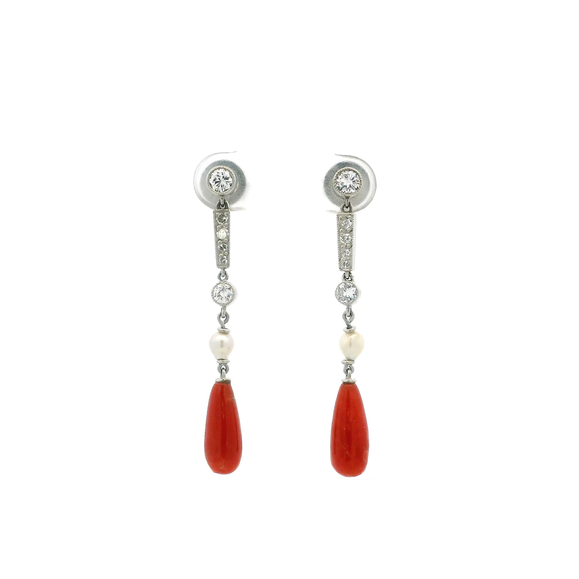 A pair of antique platinum millegrain edge old cut diamond, pearl and tear drop shaped coral drop earrings.