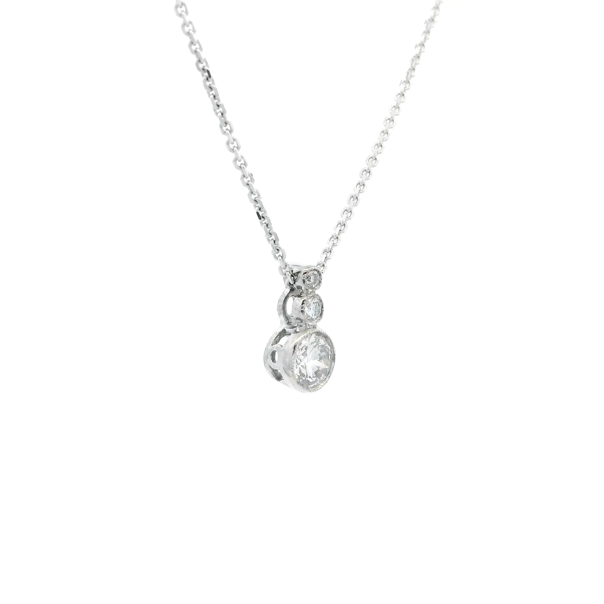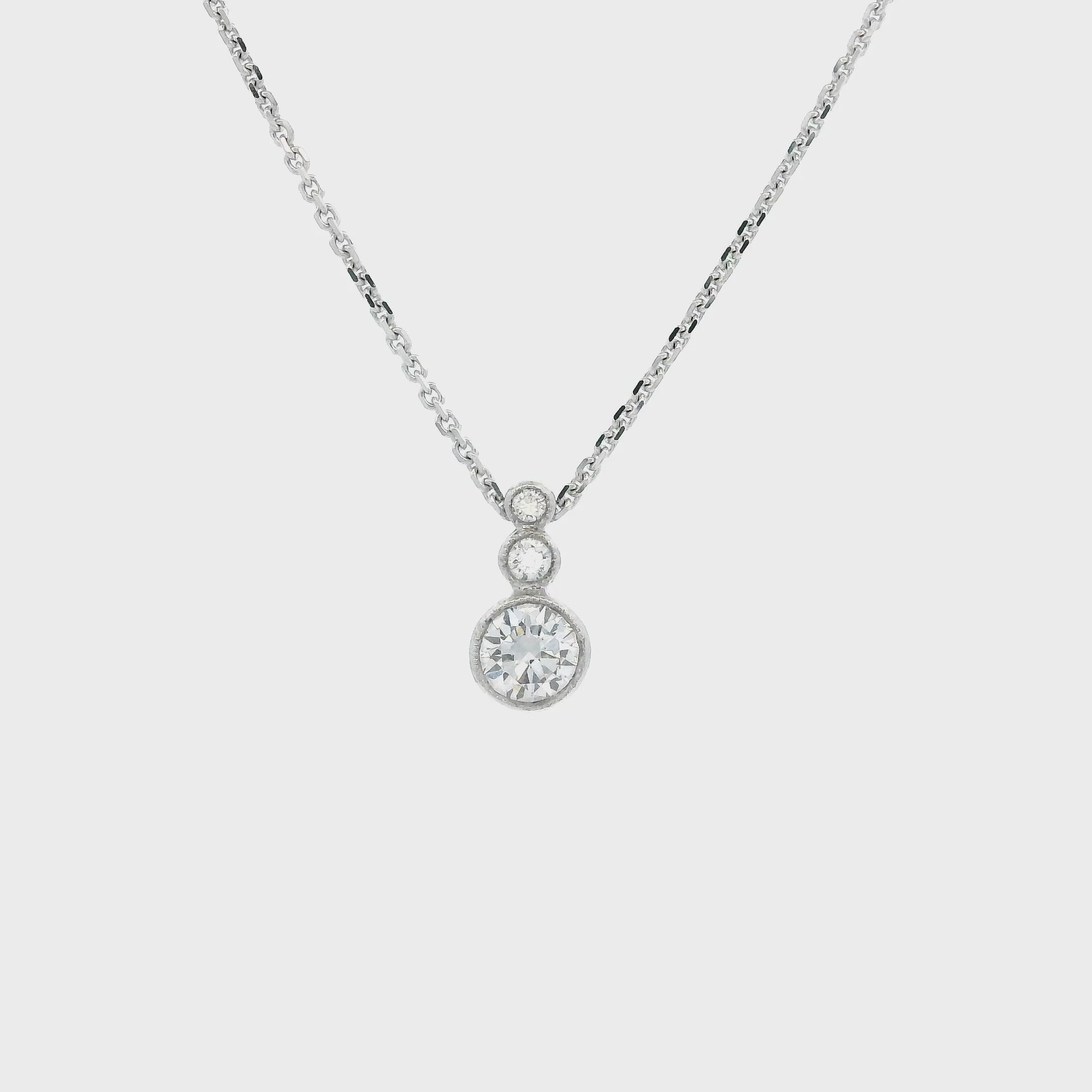 An 18ct white gold millegrain edge round brilliant cut diamond graduated three stone pendant.