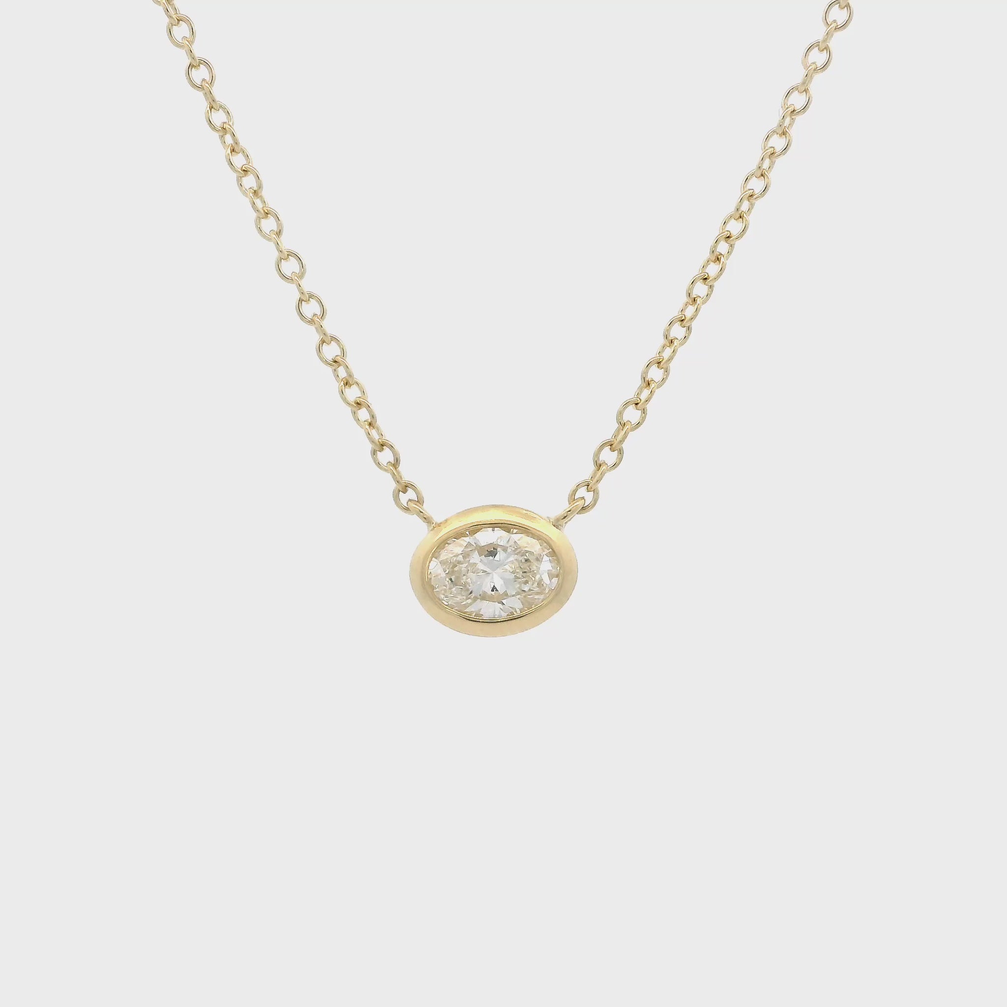 An 18ct yellow gold rubover oval cut diamond solitaire pendant on chain.