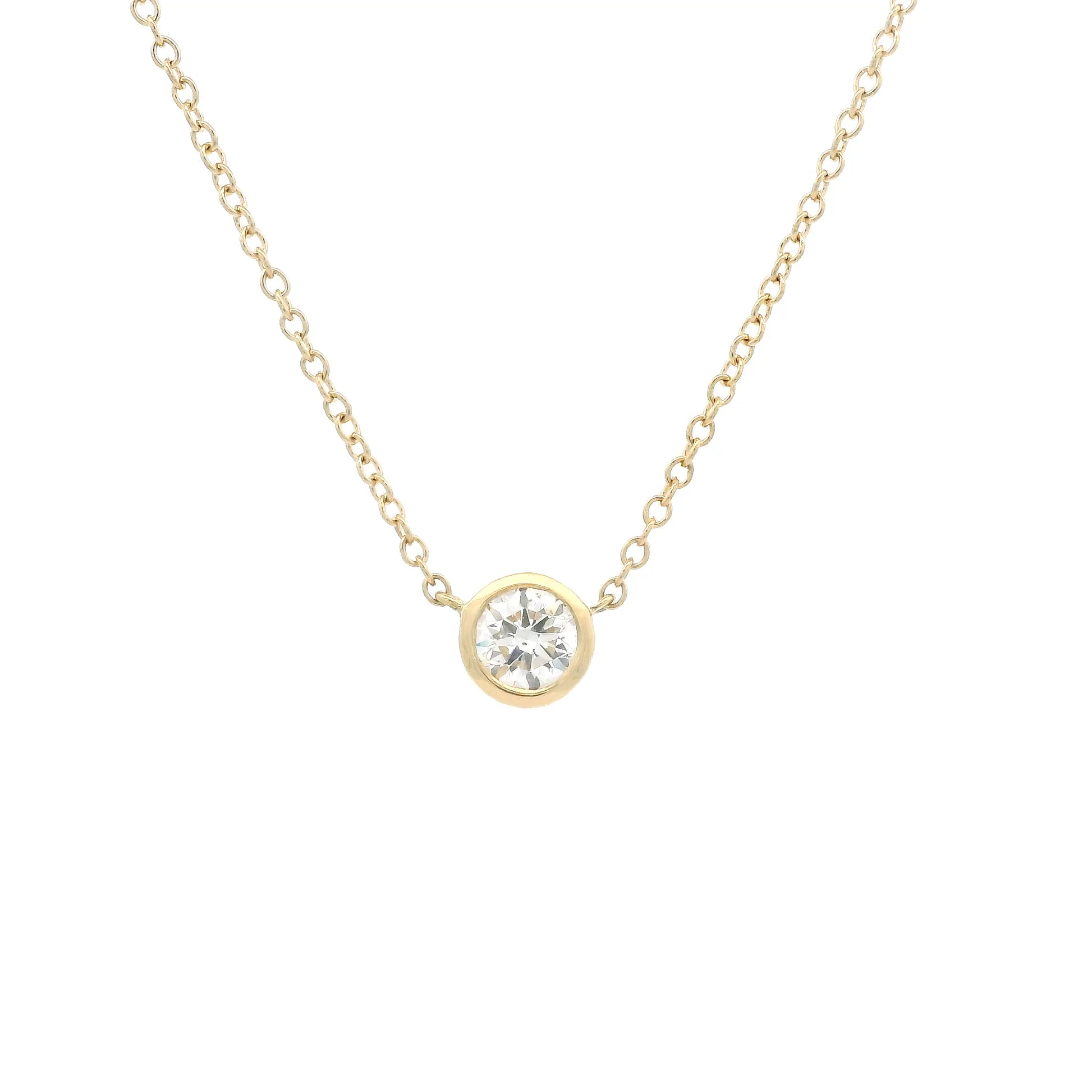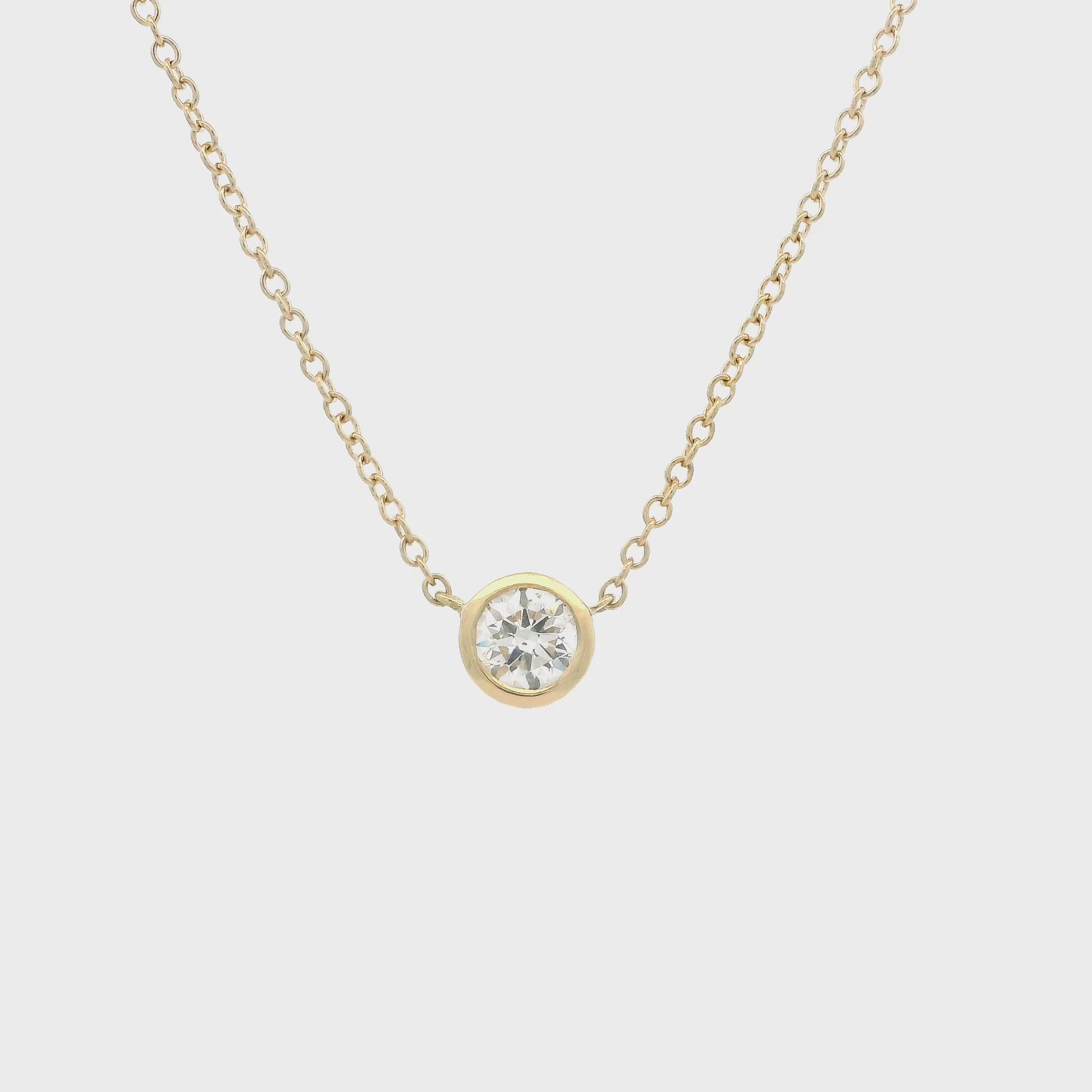 An 18ct yellow gold rubover set round brilliant cut diamond solitaire pendant.