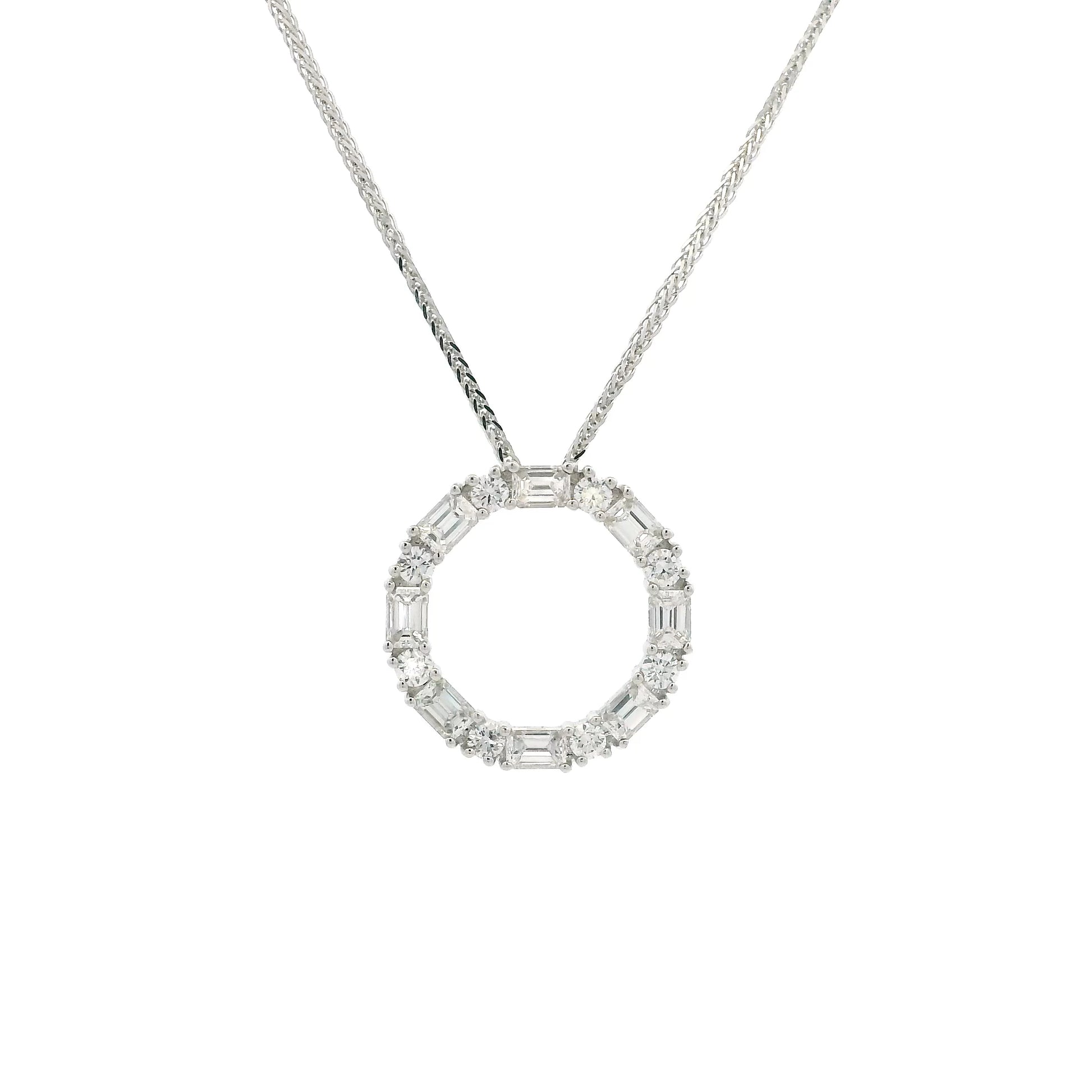An 18ct white gold claw set alternate baguette and round brilliant cut diamond circular pendant.