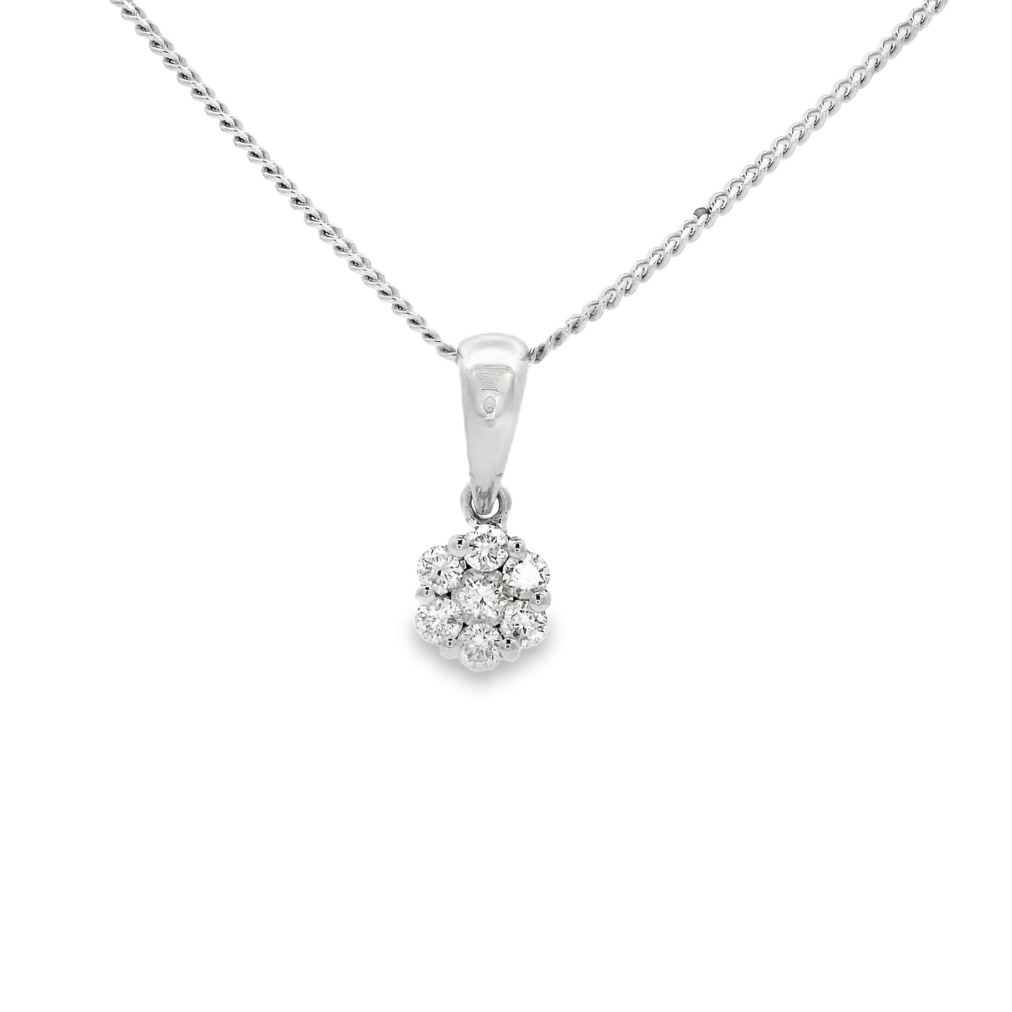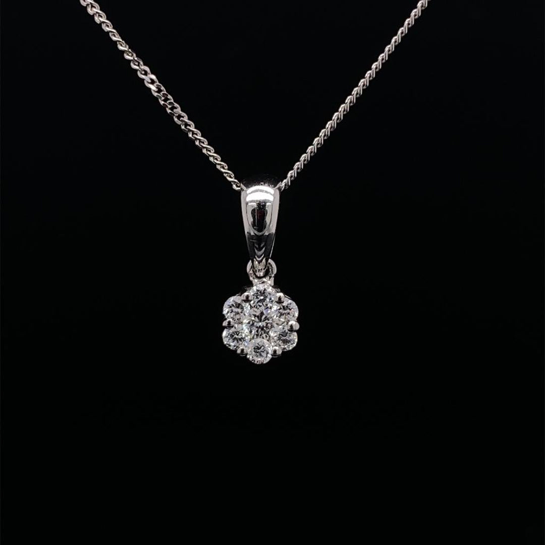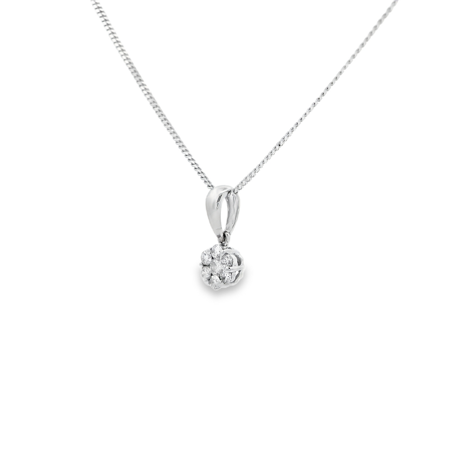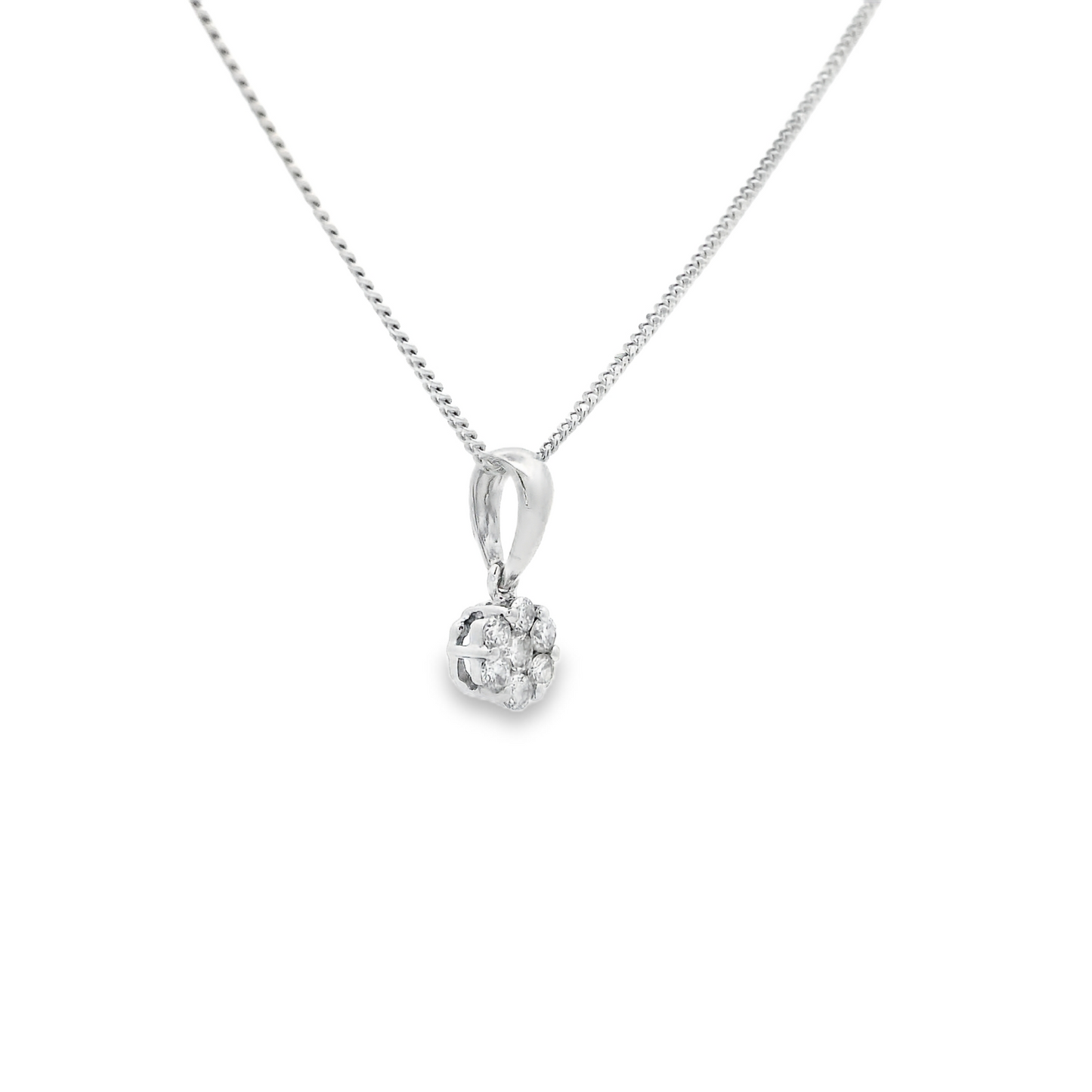 A 18ct white gold claw set round brilliant cut diamond cluster pendant.