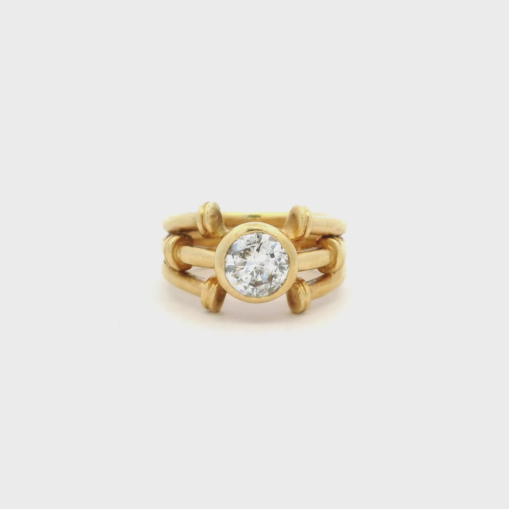 An 18ct yellow gold rubover set round diamond solitaire ring with a nail motif three row band.