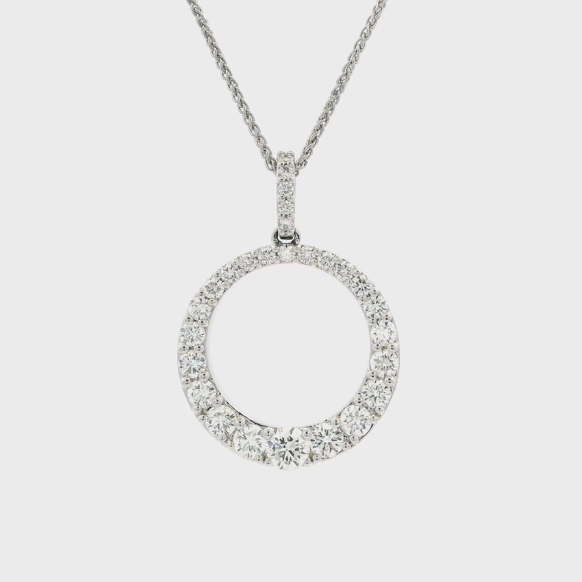 An 18ct white gold claw set graduated round brilliant cut diamond circular pendant with a diamond set bale.