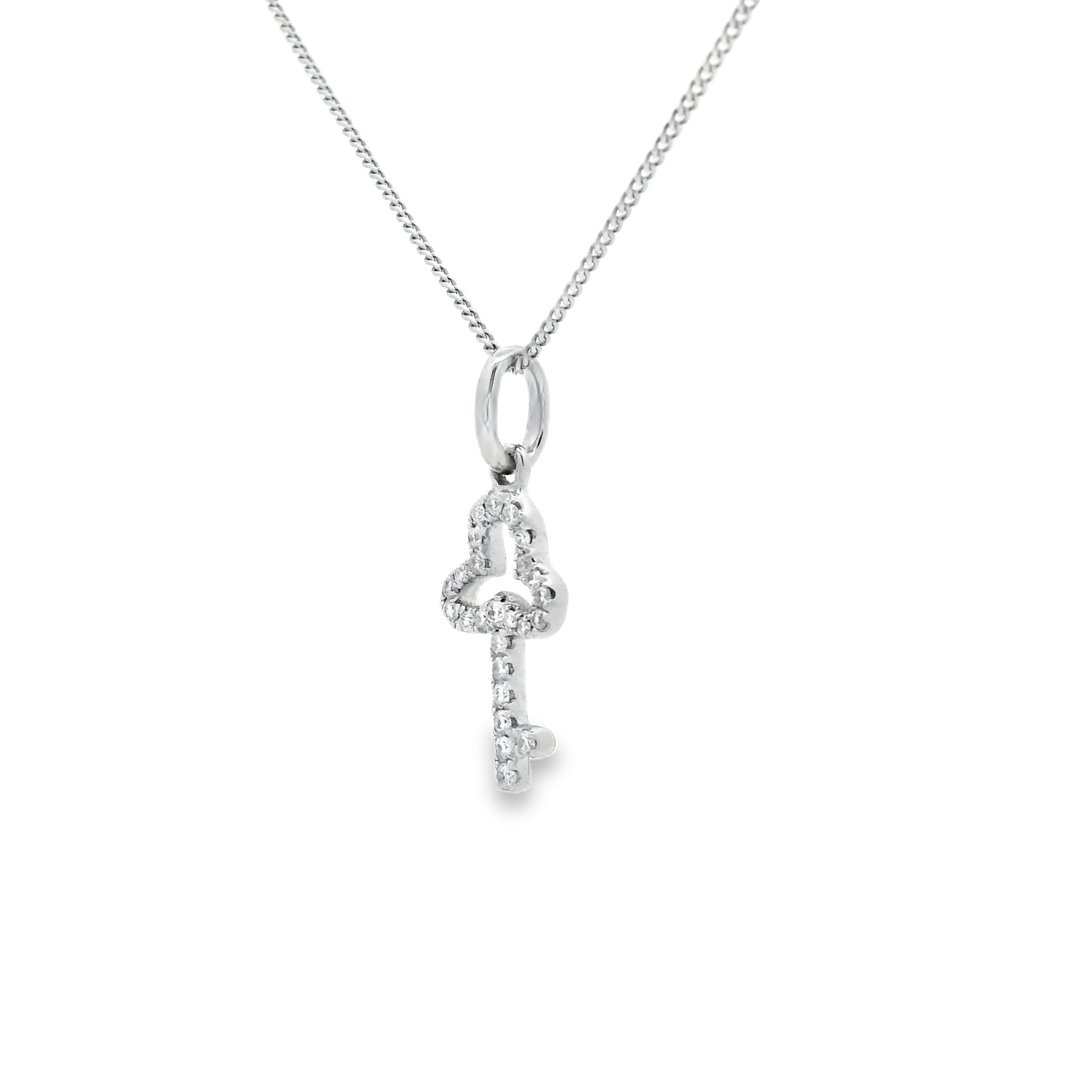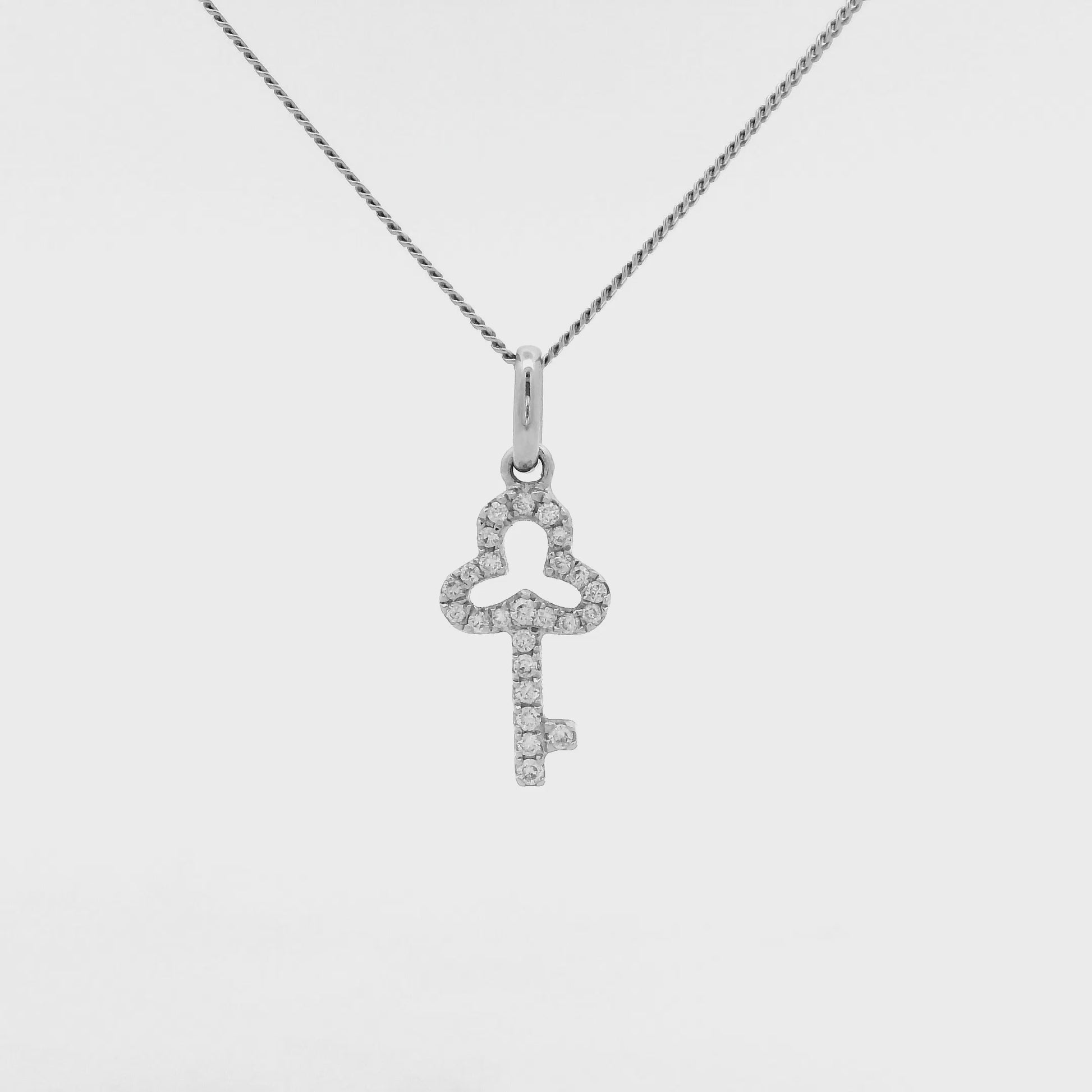 An 18ct white gold claw set round brilliant cut diamond set trefoil key pendant.