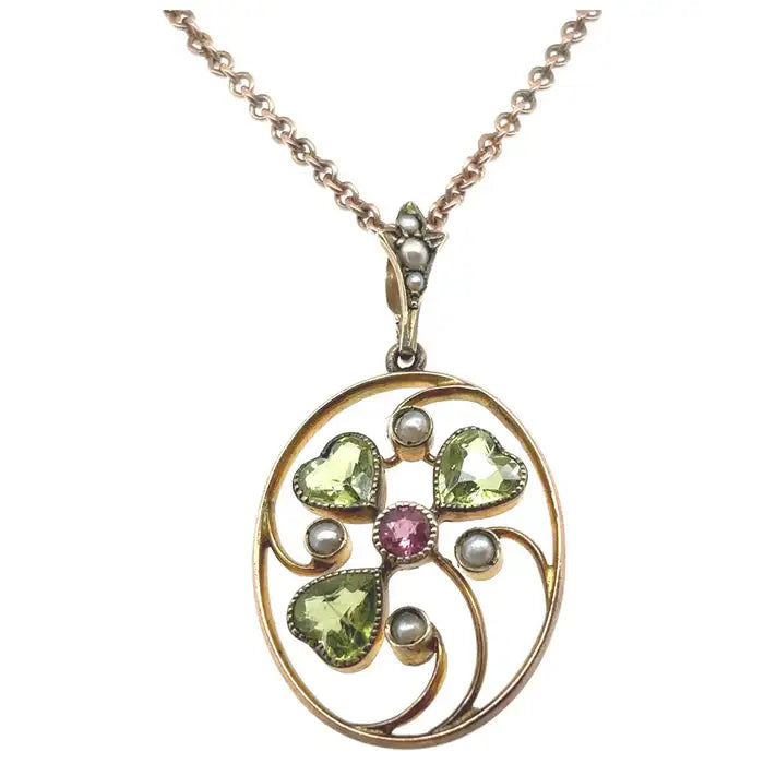 A Victorian 9ct yellow gold pink sapphire, peridot and seed pearl floral pendant. The pendant is comprised of three millegrain edge heart cut peridots and a central round pink sapphire and interspaced seed pearls.