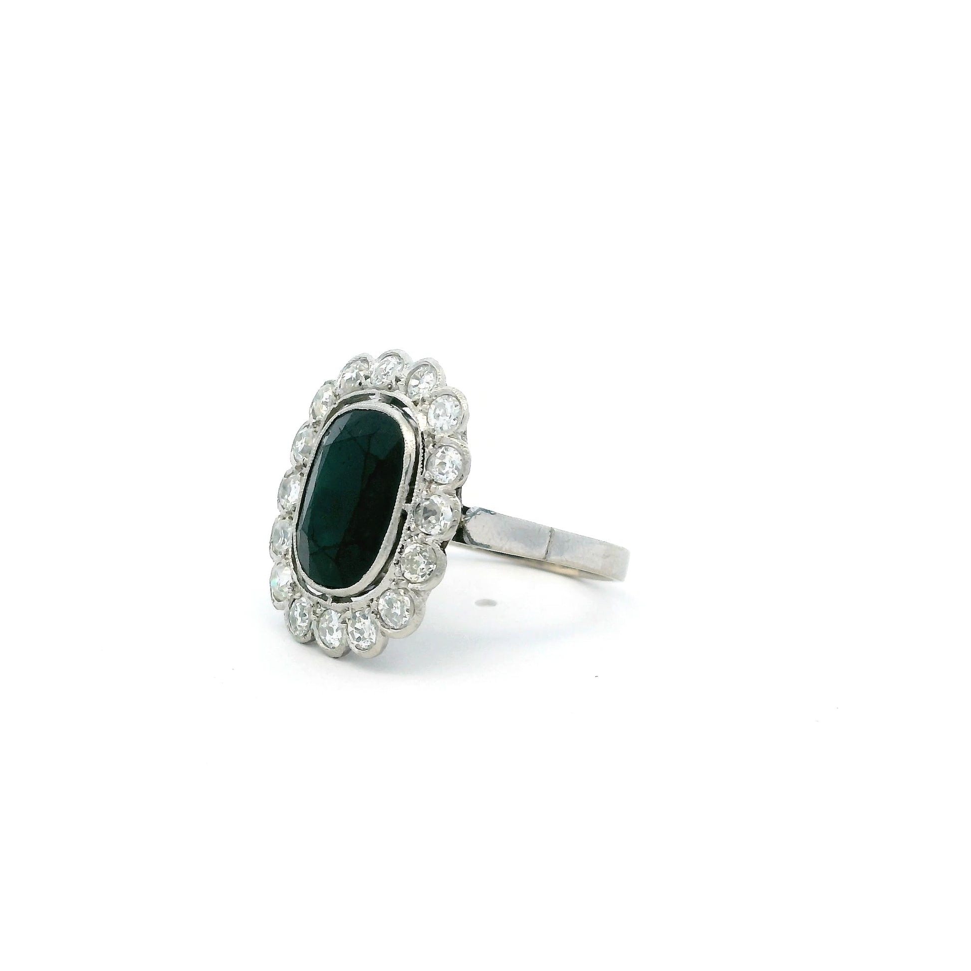 A platinum millegrain edge elongated cushion sapphire with old cut diamonds cluster ring.