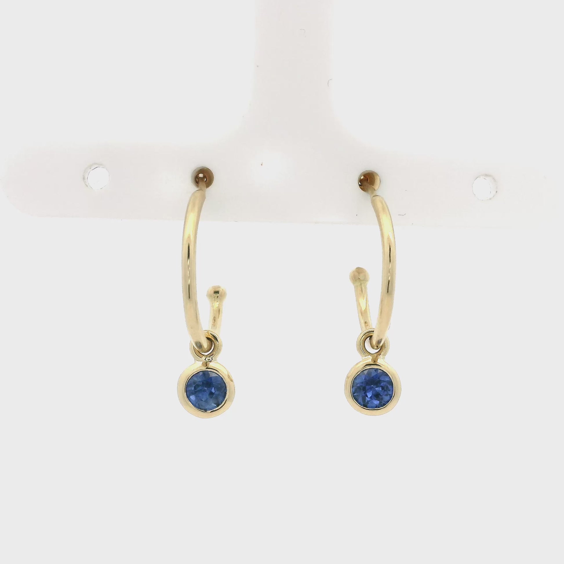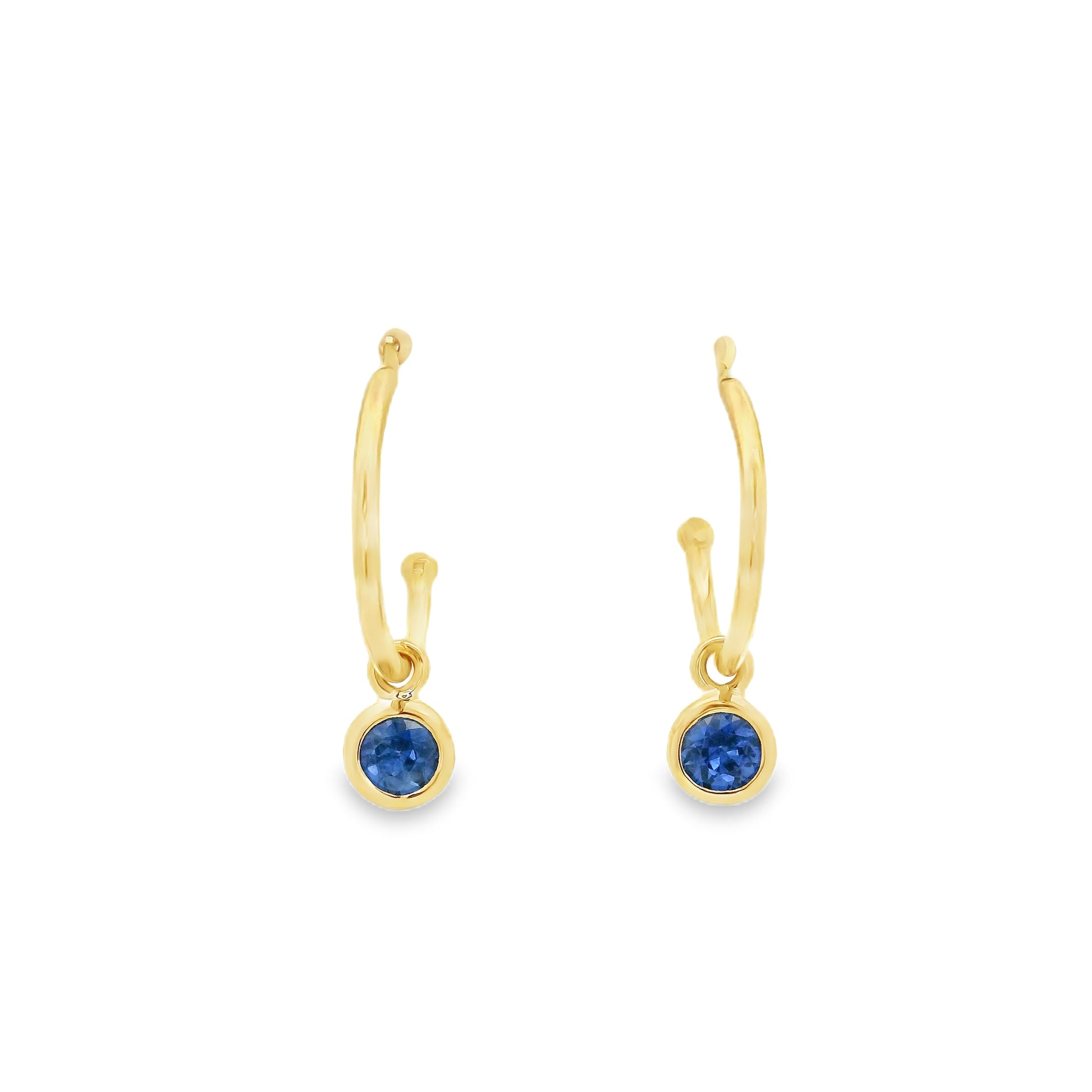 A pair of 18ct yellow gold rubover round sapphire drop on hoop earrings.